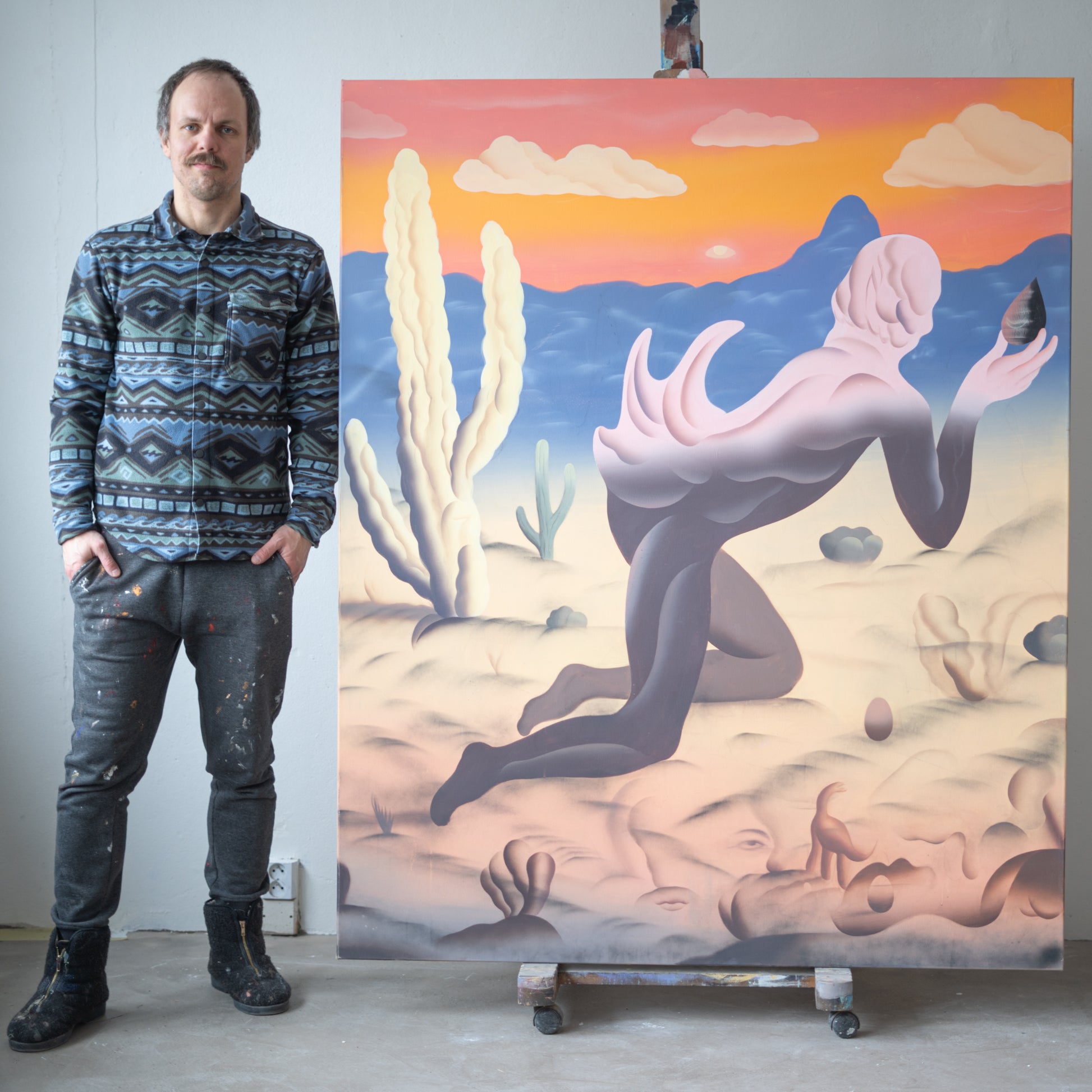 Spojení akrylové malby se sprejem mu umožňuje propojit malířskou tradici s výrazovou lehkostí a nadsázkou současného vizuálního prostředí, v němž se přirozeně prolínají galerie a ulice.