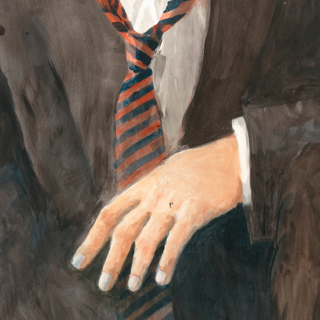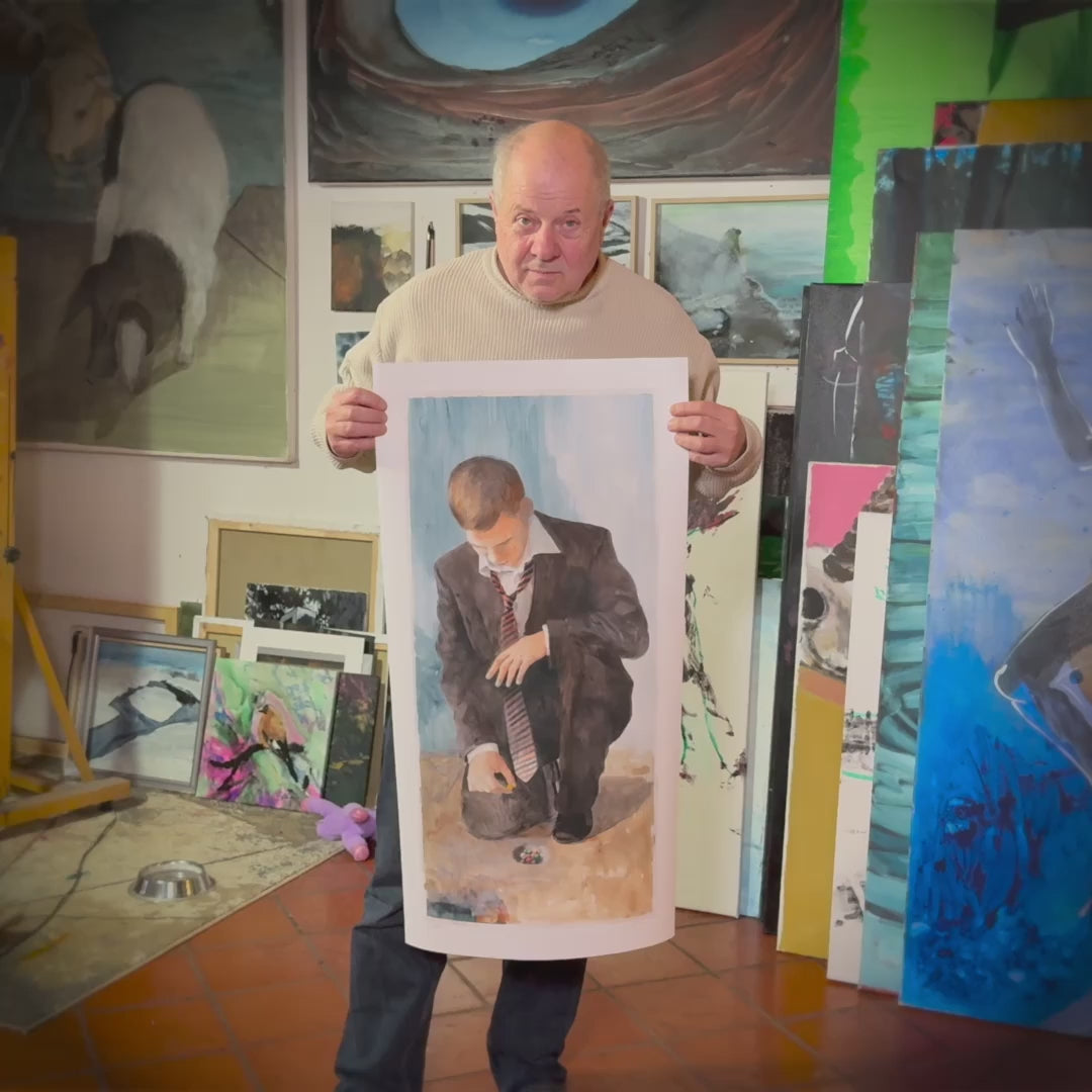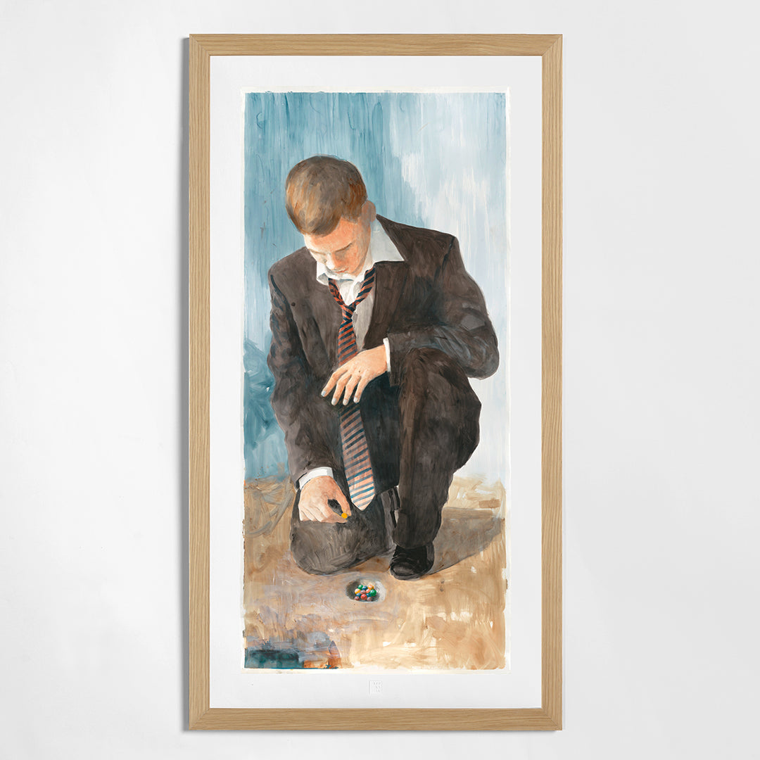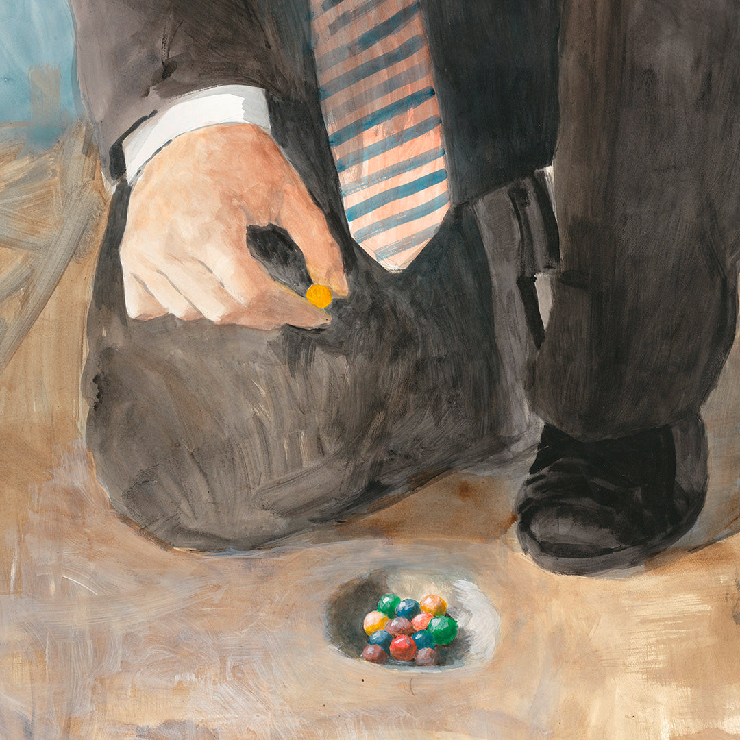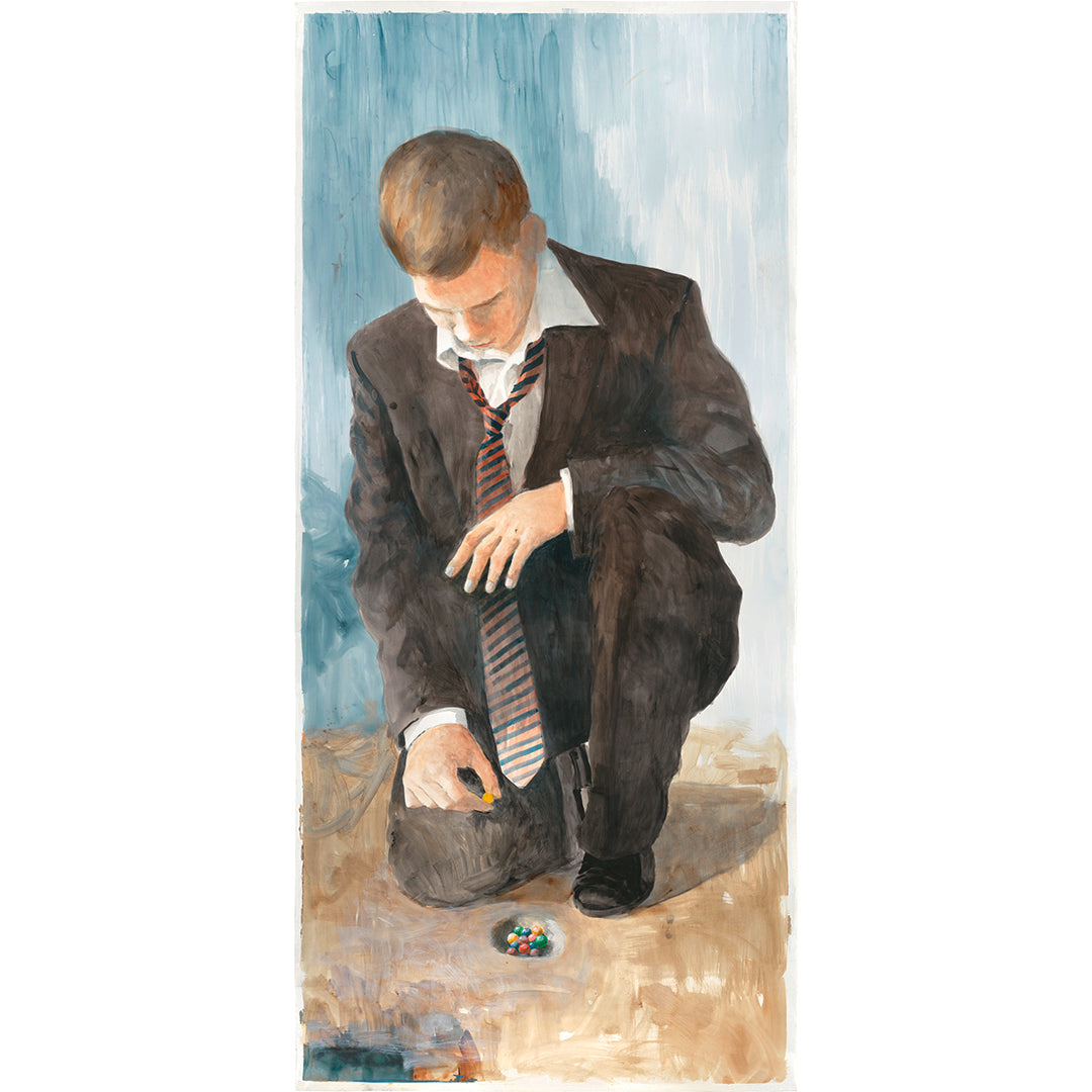 "Obraz „Pokání a jiné hry” v sobě nese silný narativ o ztrátě, pokoře a kontrastu mezi světem dospělých a nevinností dětství. Dílo vizualizuje moment, kdy se vnější symboly společenského postavení a úspěchu – tmavý oblek a kravata – střetávají s prostou, téměř zapomenutou dětskou hrou. Muž v obleku klečí v prachu. Tento postoj evokuje pokání a přiznání si vlastní zranitelnosti. Skleněné kuličky v důlku představují křehkost majetku a nejistotu trhu. To, co bylo pro dítě hrou, se v dospělém světě financí mění v nebezpečný hazard s osudem. Zobrazení připomíná, že pod maskou „silného muže” se stále skrývá křehká duše, která v krizových momentech hledá cestu zpět k základním hodnotám a možná i ke ztracenému klidu dětství."