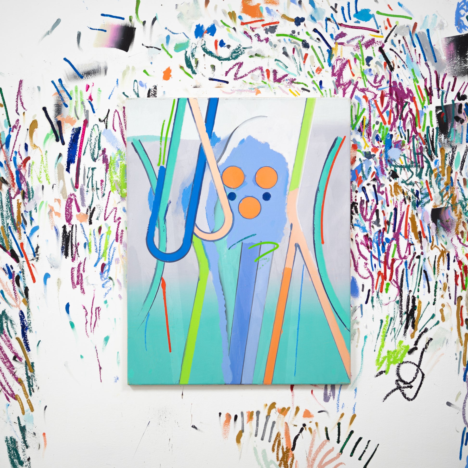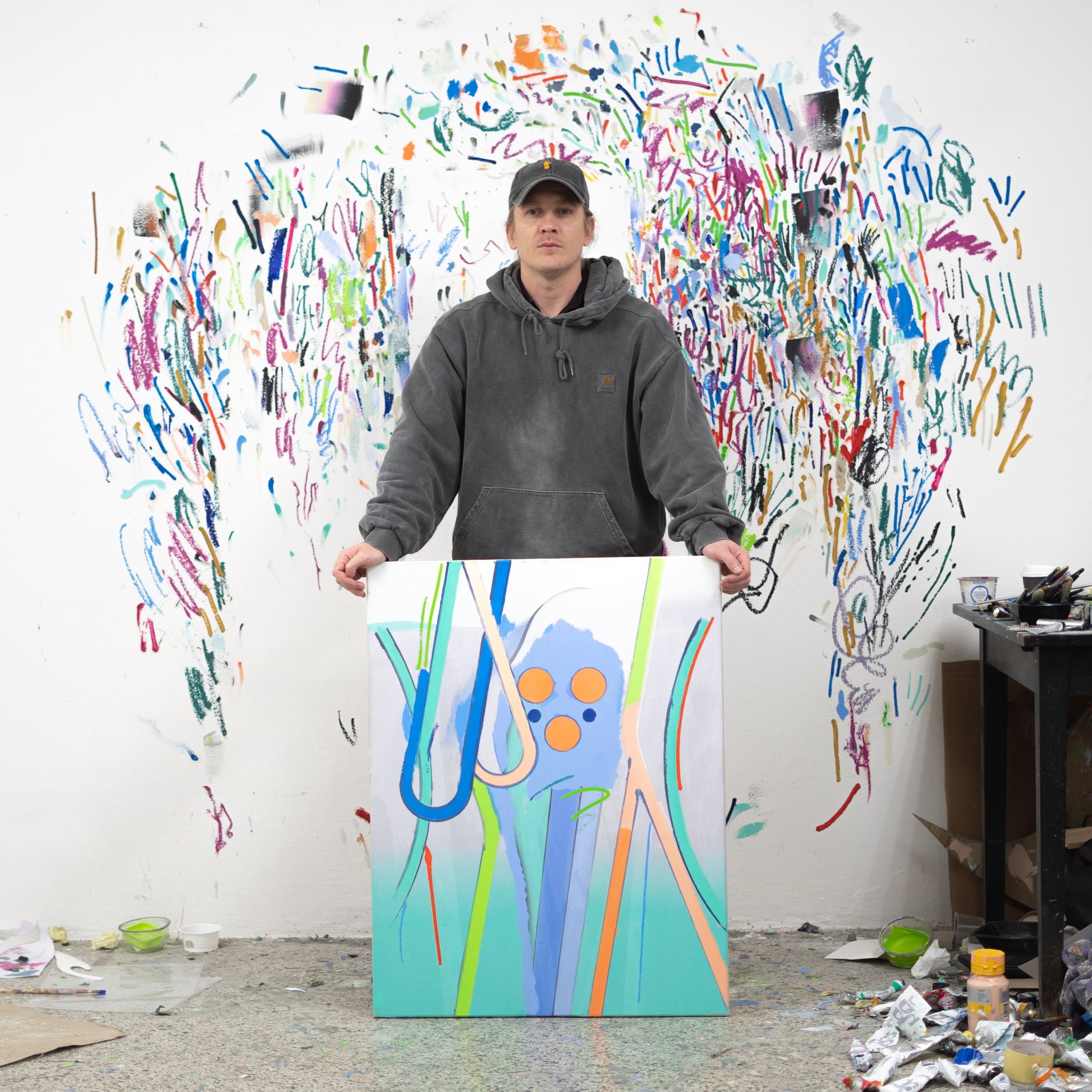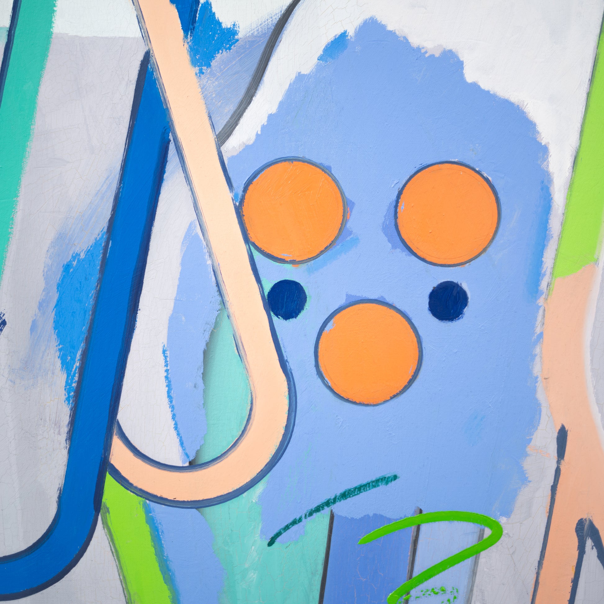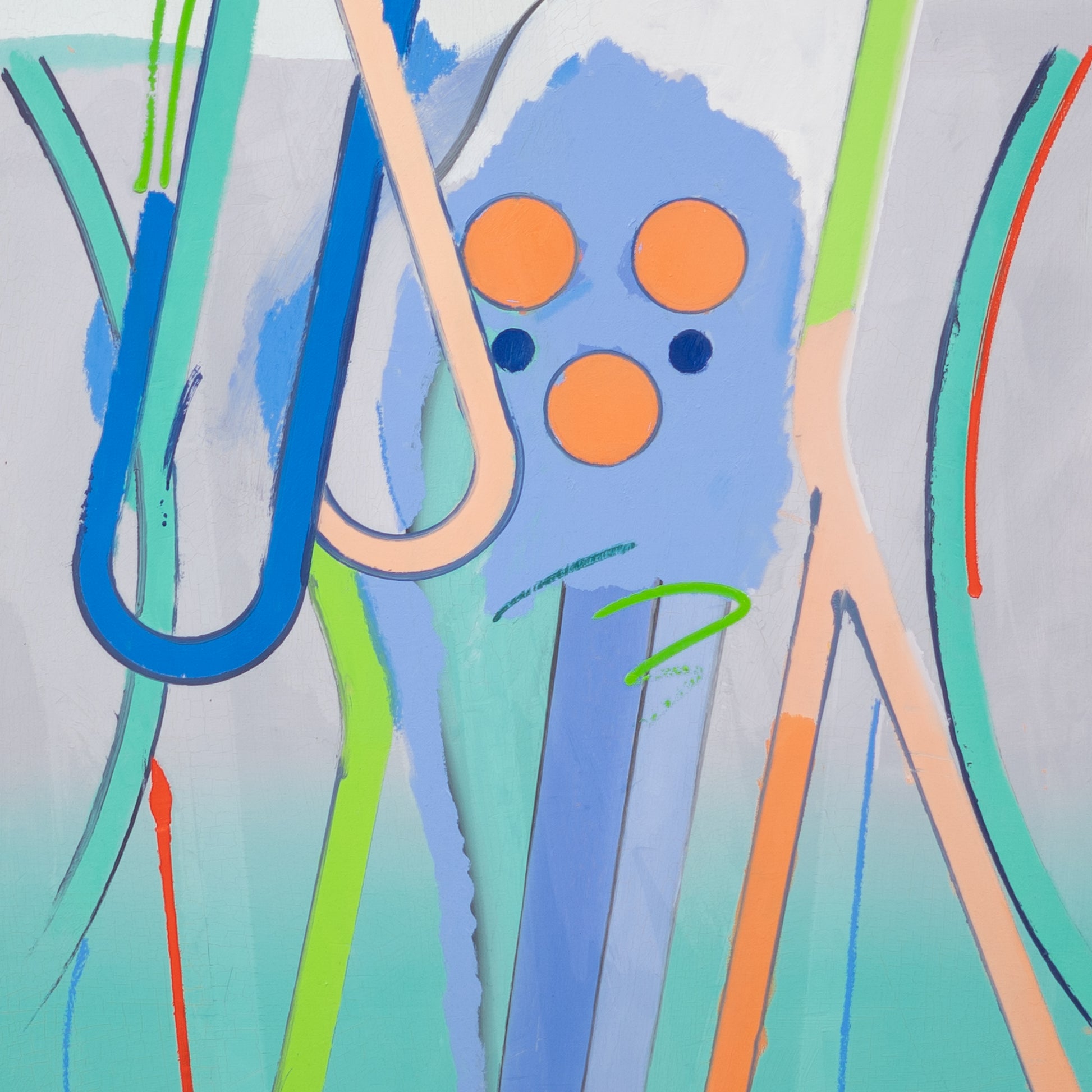 Osobitý malíř s výrazným rukopisem a obraz, který vychází z autorovy dlouhodobé série pracující s infografickou stylizací postavy. Kompozice odhaluje vnitřní konstrukci obrazu a nabízí pohled skrz jeho strukturu.