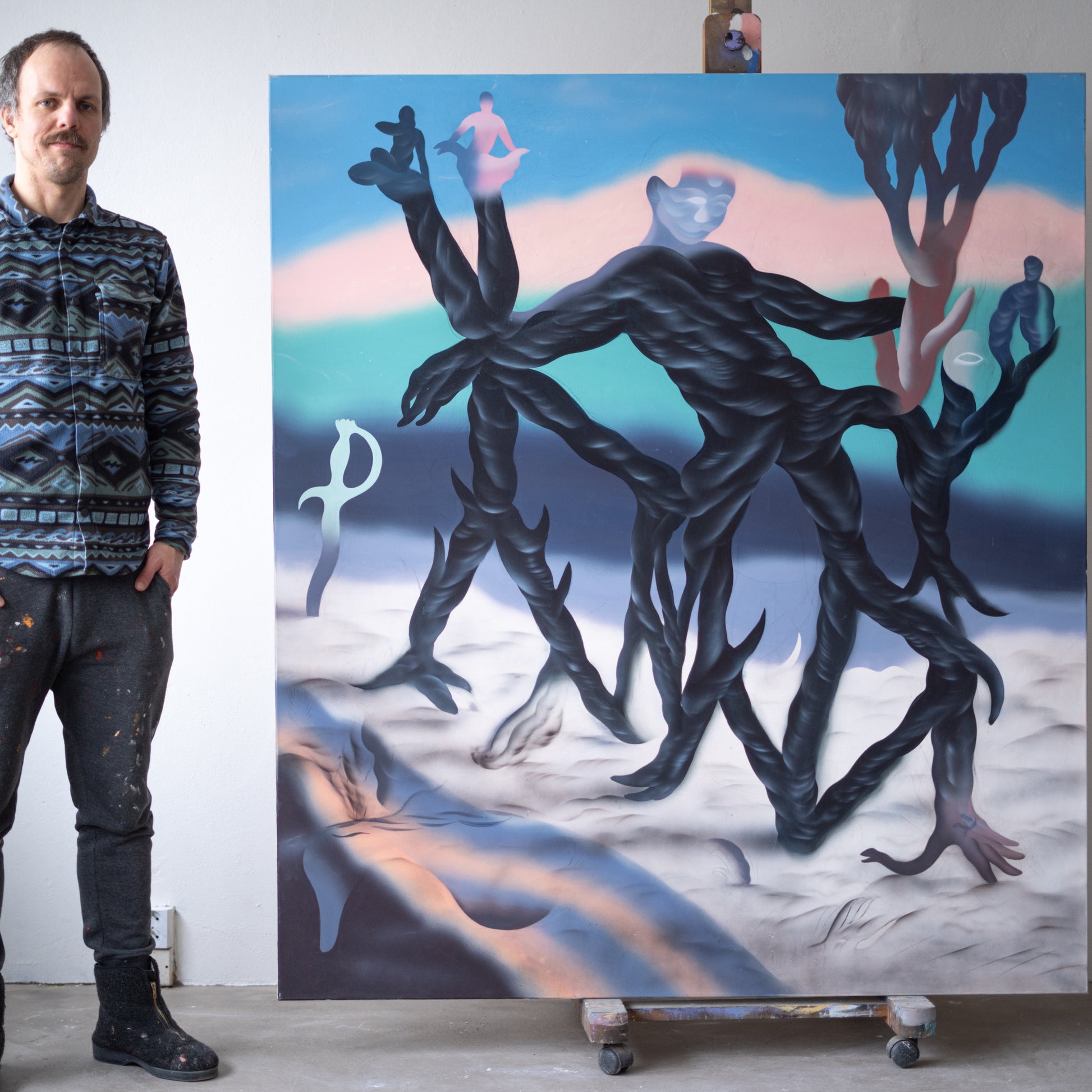 Výrazný český malíř zde představuje obraz založený na graficky strukturované kompozici a důsledné práci s linií. Kombinace kresby, spreje a šablony vytváří napětí mezi jasně vymezenými tvary a měkčími, volně se rozpíjejícími plochami. Celek působí jako vizuální průchod krajinou na pomezí reality a vnitřních světů.