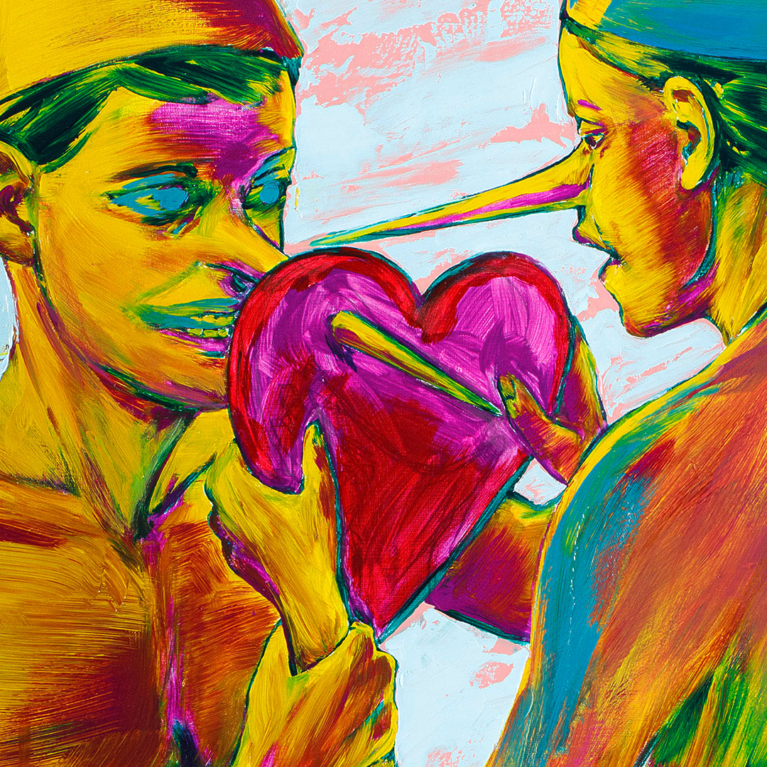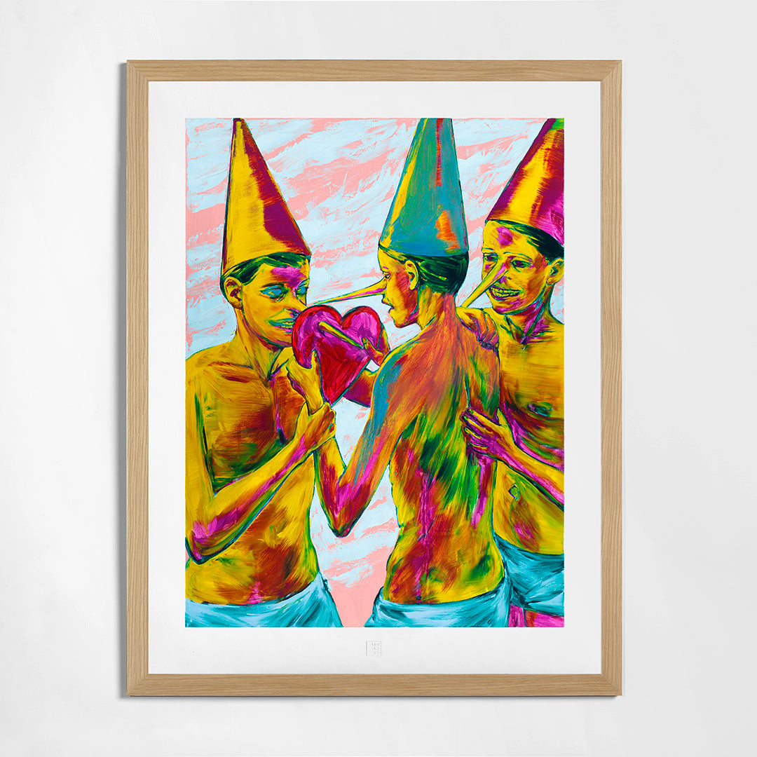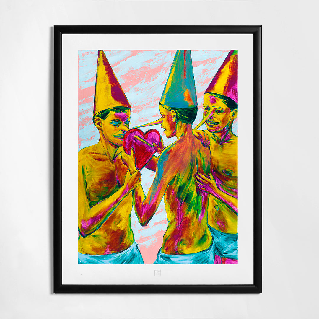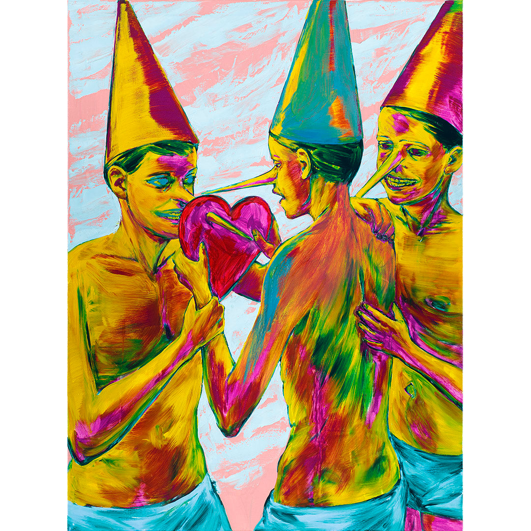 Tentokrát jsem ho použil v nové barevnosti a posunul směrem k symbolu introspektivních studií vnitřních stavů. Pinocchiové tu nejsou výbušnými, groteskními figurkami, ale spíše citlivým zrcadlem dospívající psychiky s jejími pochybnostmi a proměnami.“