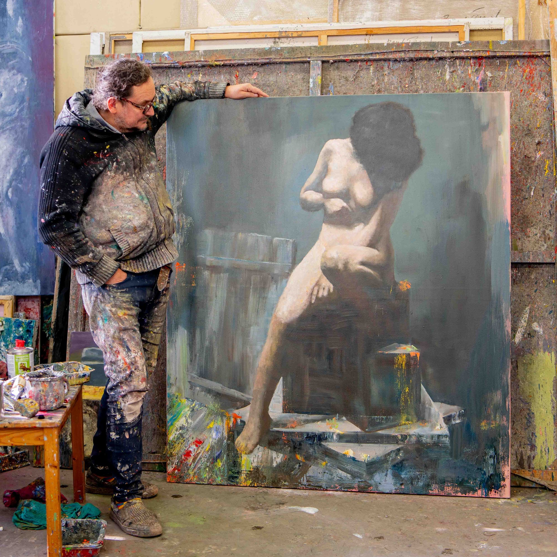 Ve Francouzce Pavel Šmíd ukazuje svou schopnost zachytit figuru nejen malířsky přesvědčivě, ale i lidsky křehce. Nahá postava sedící v ateliéru působí klidně a přirozeně, jako by byla součástí místa, kde vzniká. Tlumená barevnost, měkké světlo a jemná práce s tělesností vytvářejí atmosféru tiché intimity, která Šmídovým figurám tak dobře sedí.