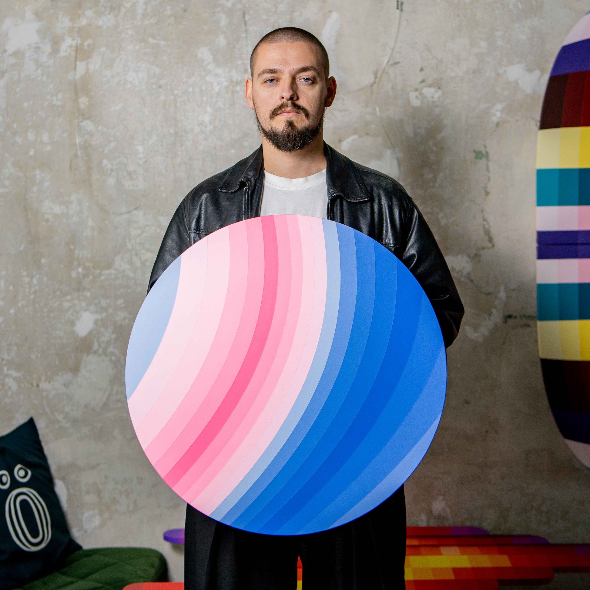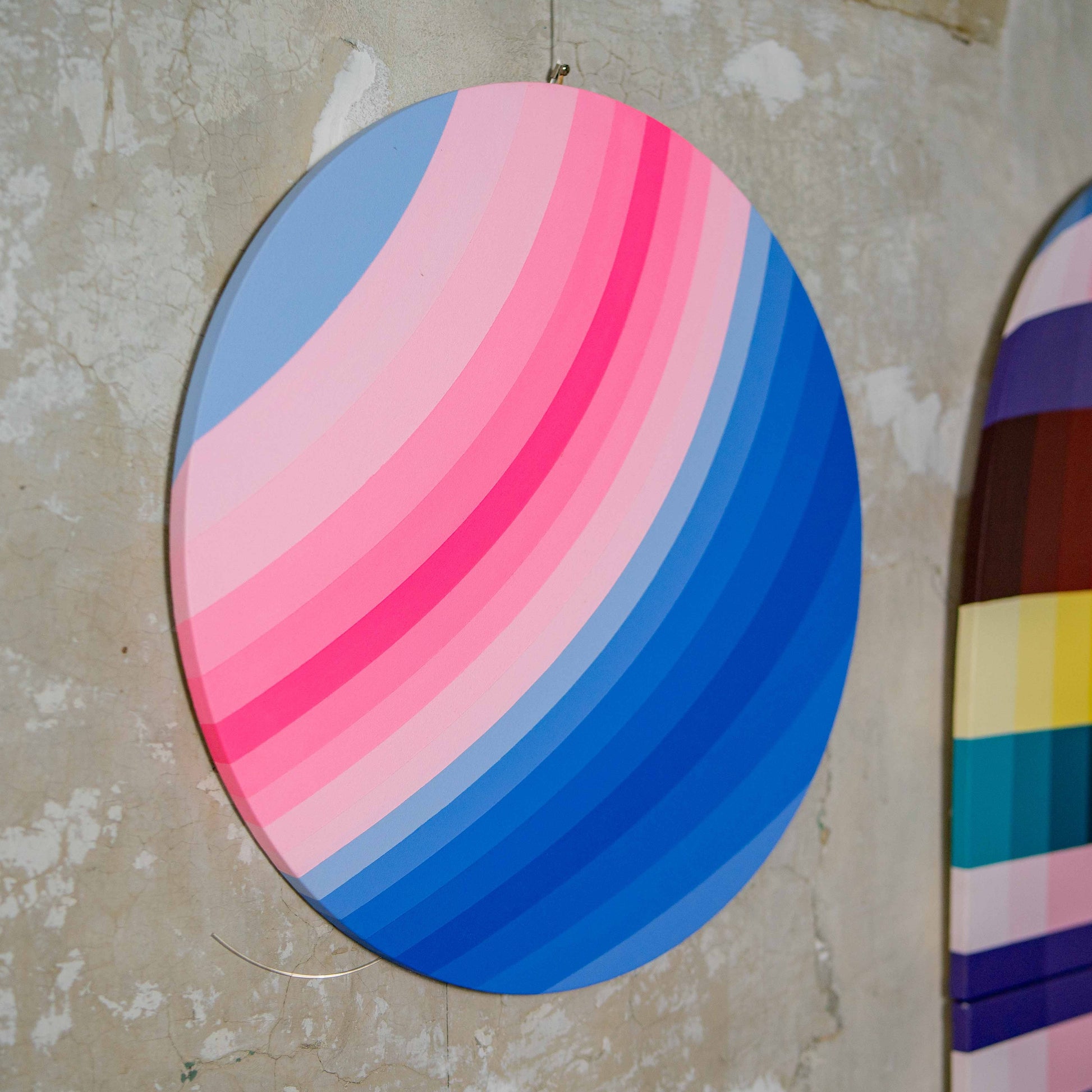 Kruhová kompozice staví na přesném rytmu barevných pásů, které se vzájemně prolínají v kontrolované gradaci. Jemný posun od studených k teplým tónům působí jako vizuální dýchání – střídání napětí a uvolnění.