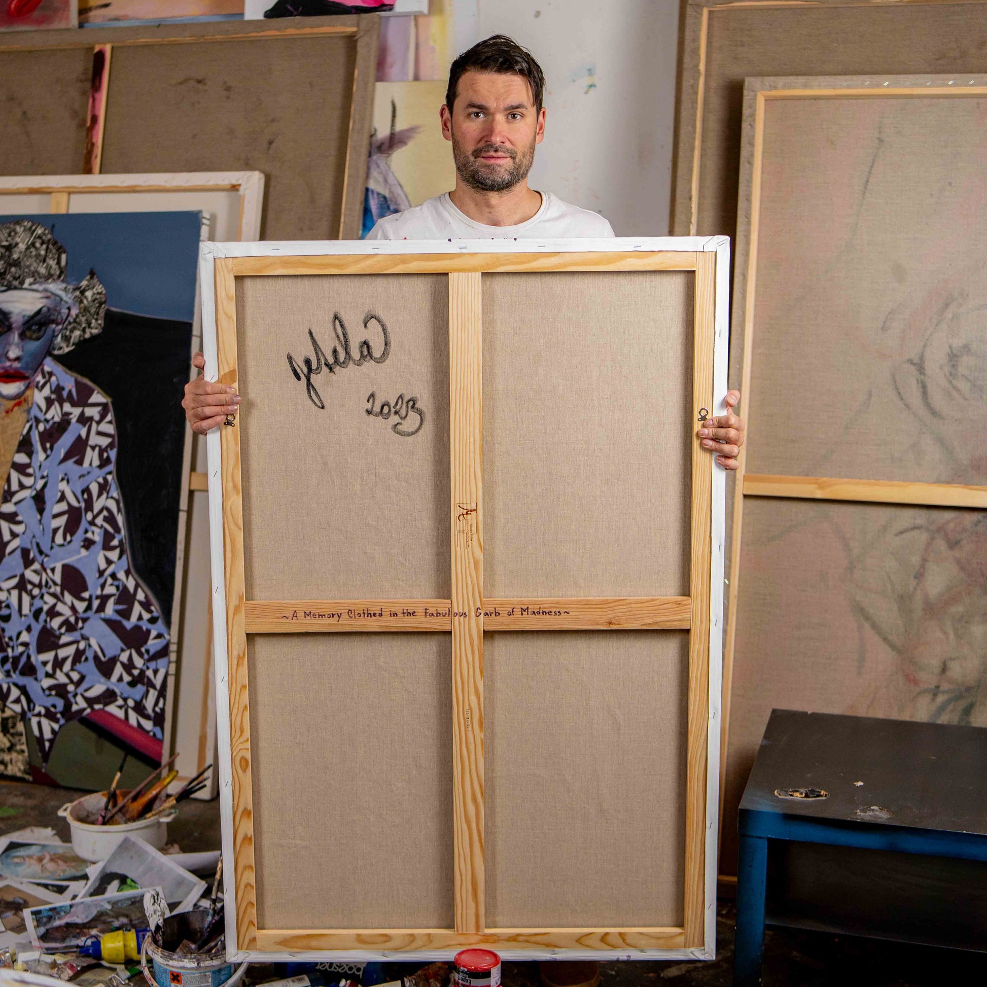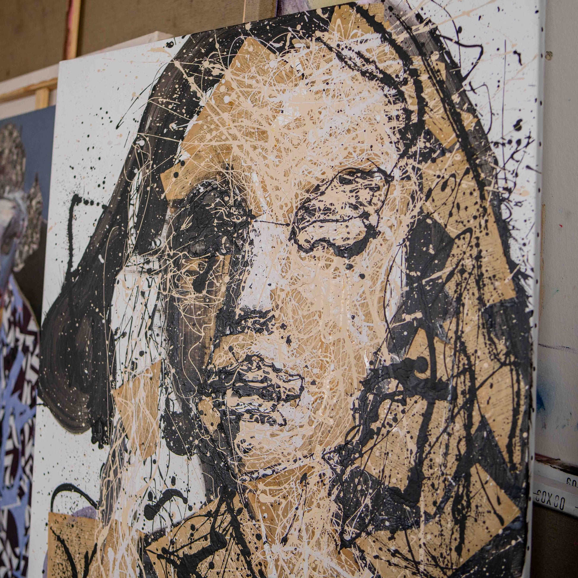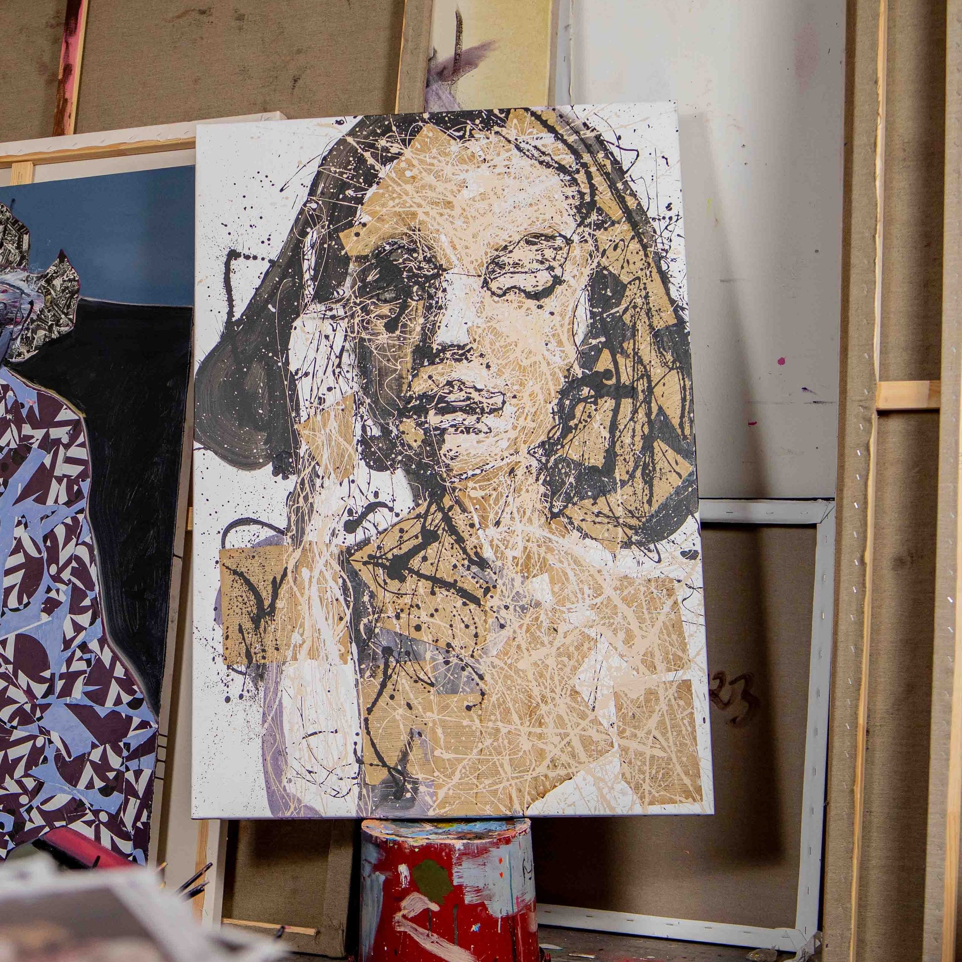 Tomáš Jetela používá techniku drippingu k tomu, aby z chaotických vrstev barev nechal vystoupit křehký, tajemný portrét. Výraz a gesto postavy zůstávají otevřené interpretaci, díky čemuž má obraz silnou atmosféru a osobní nádech.